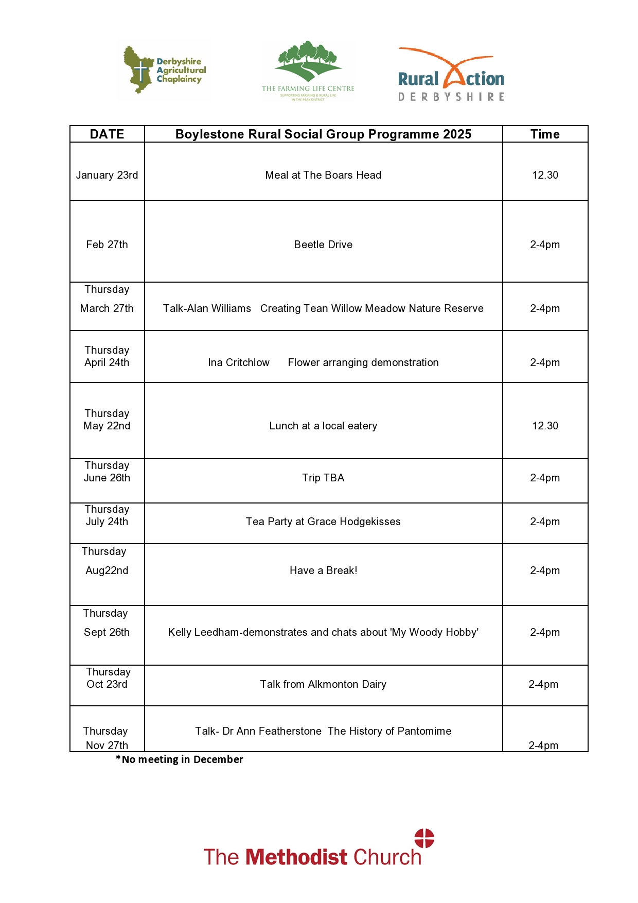 See programmes for dates. They are lively meetings of rural residents including a number of retired and semi-retired farmers and family members who meet for tea and a chat with meals out and speakers thrown in for good measure.